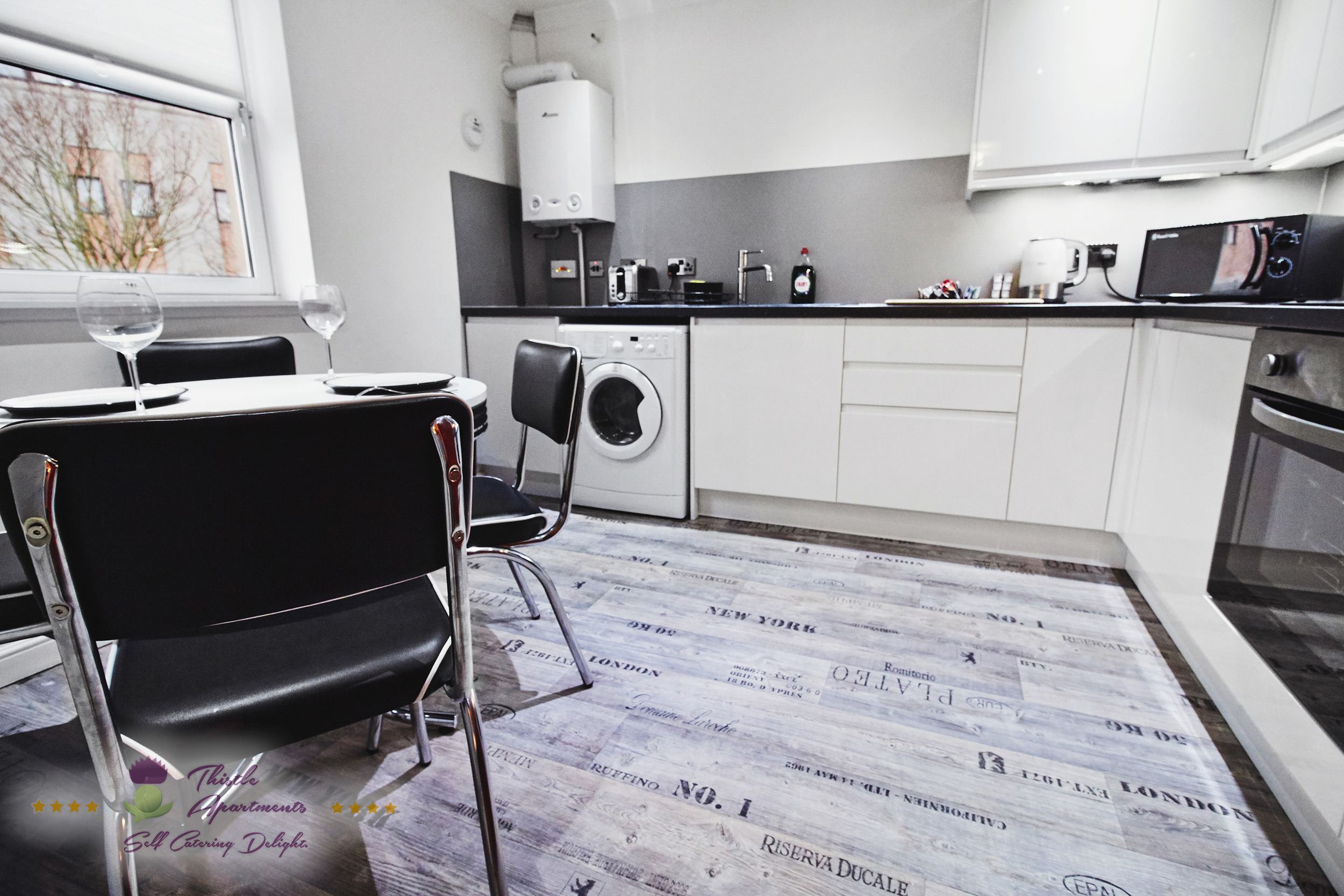 This beautifully furnished first floor apartment is located in heart of Aberdeen within secure apartment complex. Location is quiet and each apartment has it’s own allocated parking space for one car. This 2 bedroom property is located within 2 minutes walk to main high street and surrounded by places of interest, restaurants and shopping centres. Marischal Square Deluxe Apartment features comfortable lounge and sitting room, dining kitchen with hard wood oak flooring and washer/dryer. Spacious bedrooms offer comfort with each room fitted with TV. Upper floors are only accessible by the stairs.